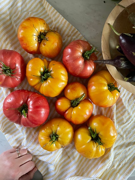 It’s fitting that we’re sending our first newsletter out into the world on Mother’s Day. Parents have a direct hand in crafting someone’s food story. As mothers and as daughters, Gaby and I know this well. It’s something I think about a lot. And I realized awhile ago that tomatoes have become a central character in my own food story - and those of my children. There’s a photo of me as a toddler eating a bright red, juicy, tomato like an apple. My grandparents ate them fresh, sliced and salted in the summer. My mother’s Louisiana upbringings made appearances in tomato laden jambalaya suppers on our table. Marcella Hazan’s tomato sauce is one of the first recipes I added to my young family’s house menu. And now, we plant them each year in our small garden. Tomatoes on the table bring me comfort. They evoke a sense of home, of rootedness.