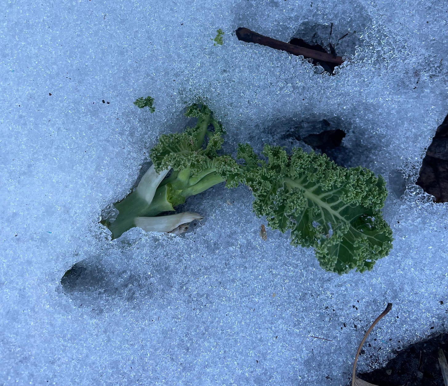 So after I am done refilling the bird feeder I pause to look over at the winter garden under a blanket of snow. And I try to learn. It appears to be still. Silent, dormant, resting. But then I see it: a small green leaf, reaching up through the ice, toward the sun, toward a breath of air. It’s kale, emerging after a spell of well below freezing weather, a remnant of my fall garden that I did not till under. What a little stinker is all that I can think. It’s admirable, this little leaf, but I also take note that its effort is mostly futile. It looks frostbitten and is probably inedible. It won’t be eaten by us, at least; I’ll throw it out for the deer. But dammit if that little kale does not make me want to persevere! To create something in a season that tells me I shouldn’t. And also to lean into stillness, to rest. All at once. I did that this week, when I asked my mom if the kids could spend the night so I could just be still. But in the quiet, I have also been creating. Because in stillness we can often find inspiration. Whether that pushes us toward rest (being) or movement (doing), is variable. And maybe futile. Even nature, sometimes, has trouble figuring out which one to choose. Do you?